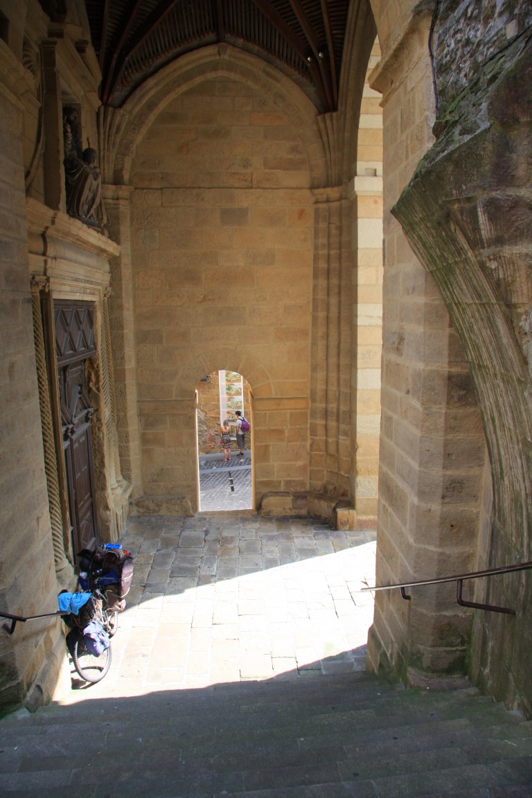 Après quelques chipirons nous empruntons les petites rues de la ville pour rejoindre la route principale que nous quittons (10,7 km) pour un chemin sur la droite (flèches jaunes).