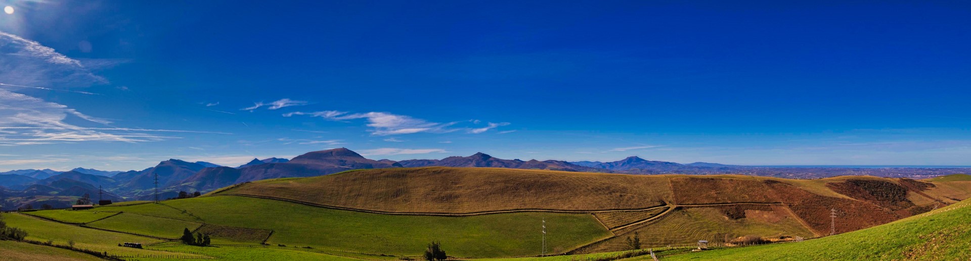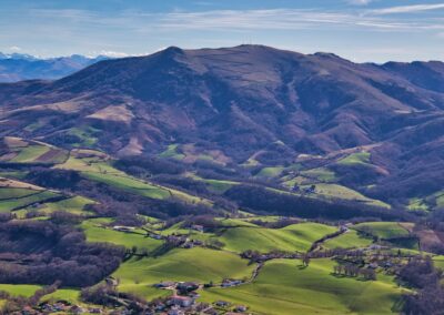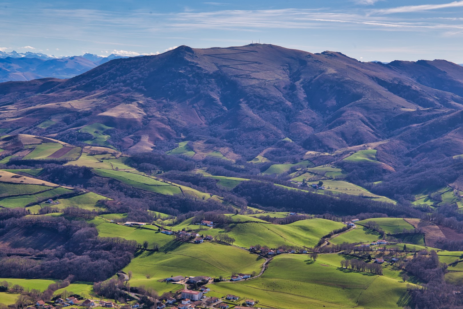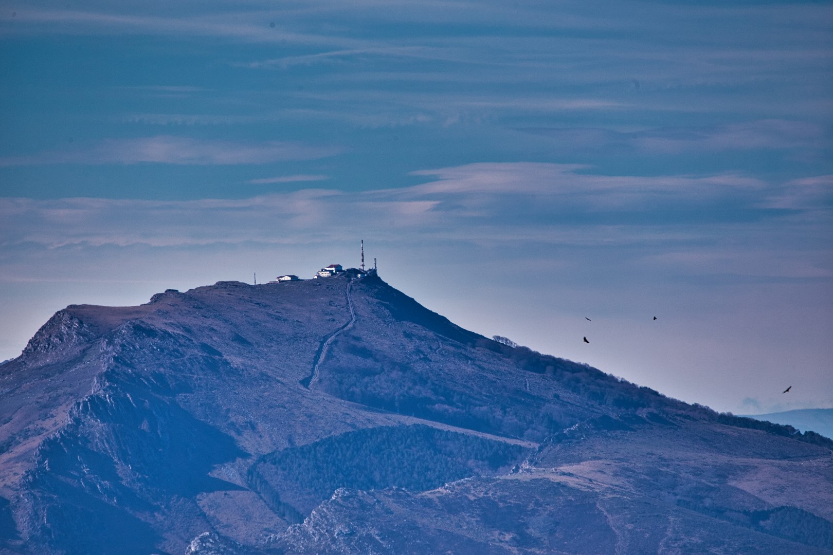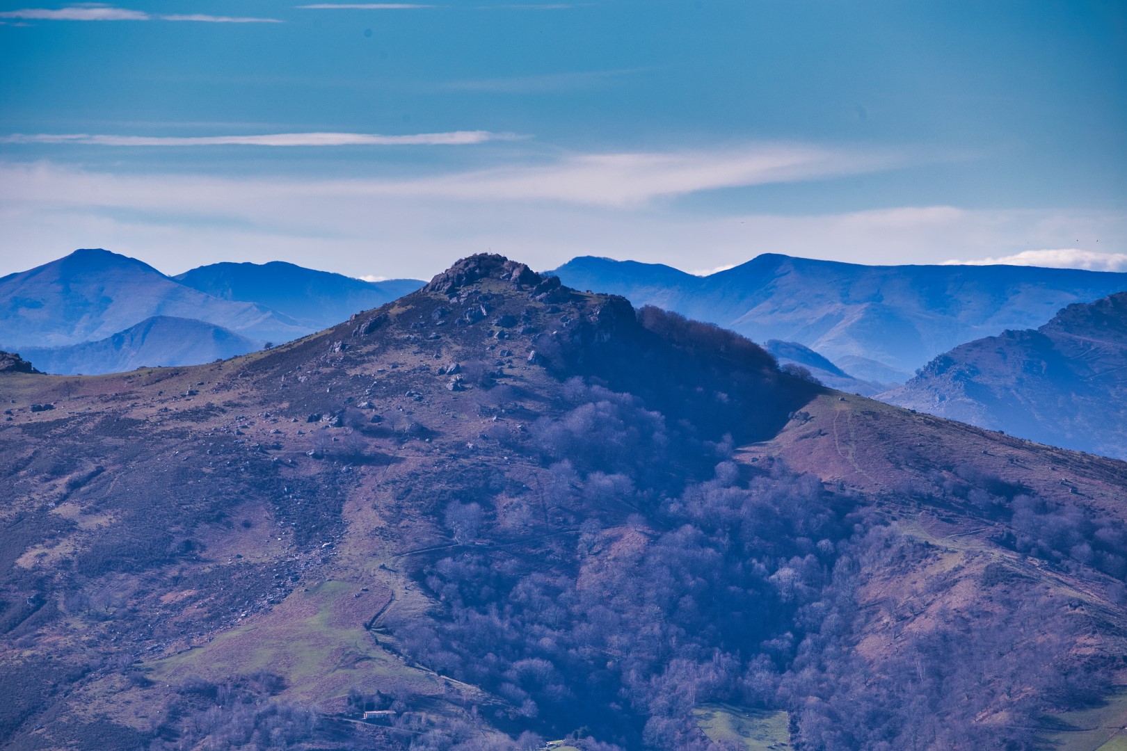 La suivre pendant 600 m en traversant un autre bois de châtaigniers. A 5,10 km, laissez le chemin au niveau du virage à droite et prendre à gauche le sentier qui fait un angle aigu. Rejoignez la grange,belle vue sur l’Artzamendi et le Mondarrain, et prenez à droite la piste blanche pendant environ 400m. Quittez la piste en prenant un chemin à gauche; 100m plus loin passez près d’une petite maison avec un pin. Suivez le sentier en restant toujours sur la gauche. A 6,4 longez un bosquet et au croisement suivant prenez à gauche puis atteindre le sommet.