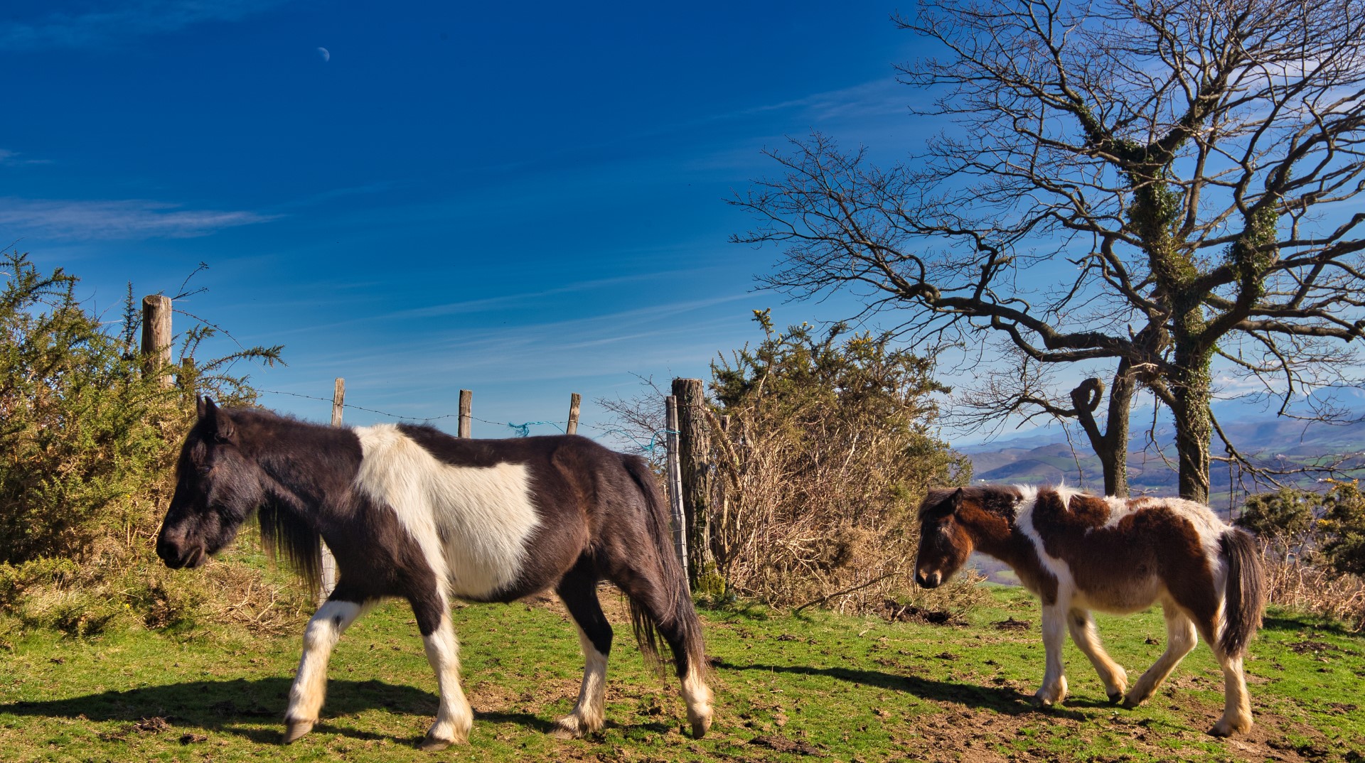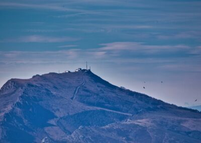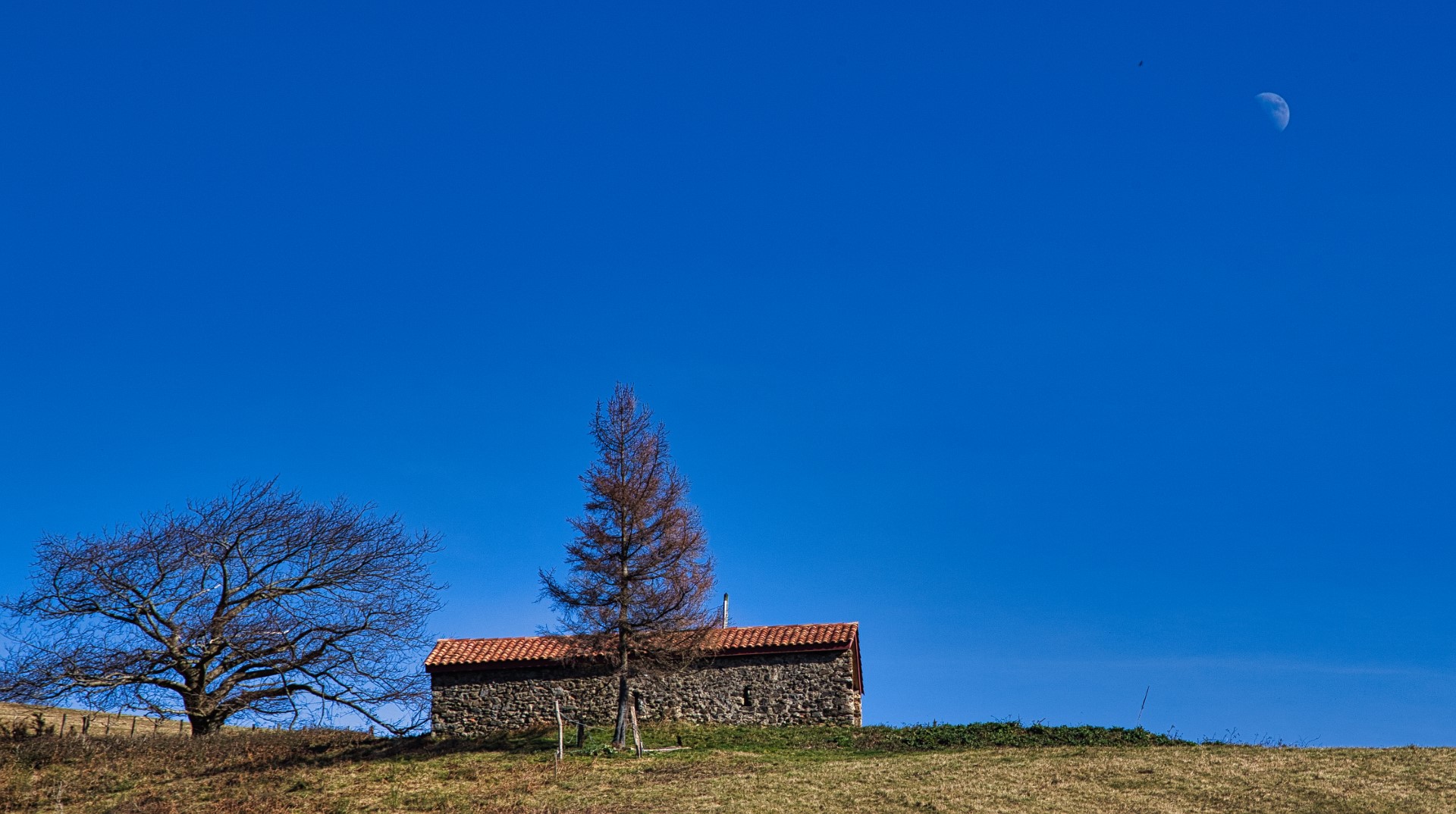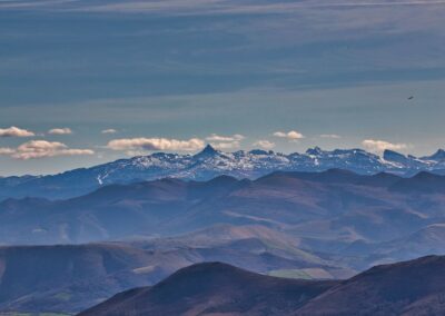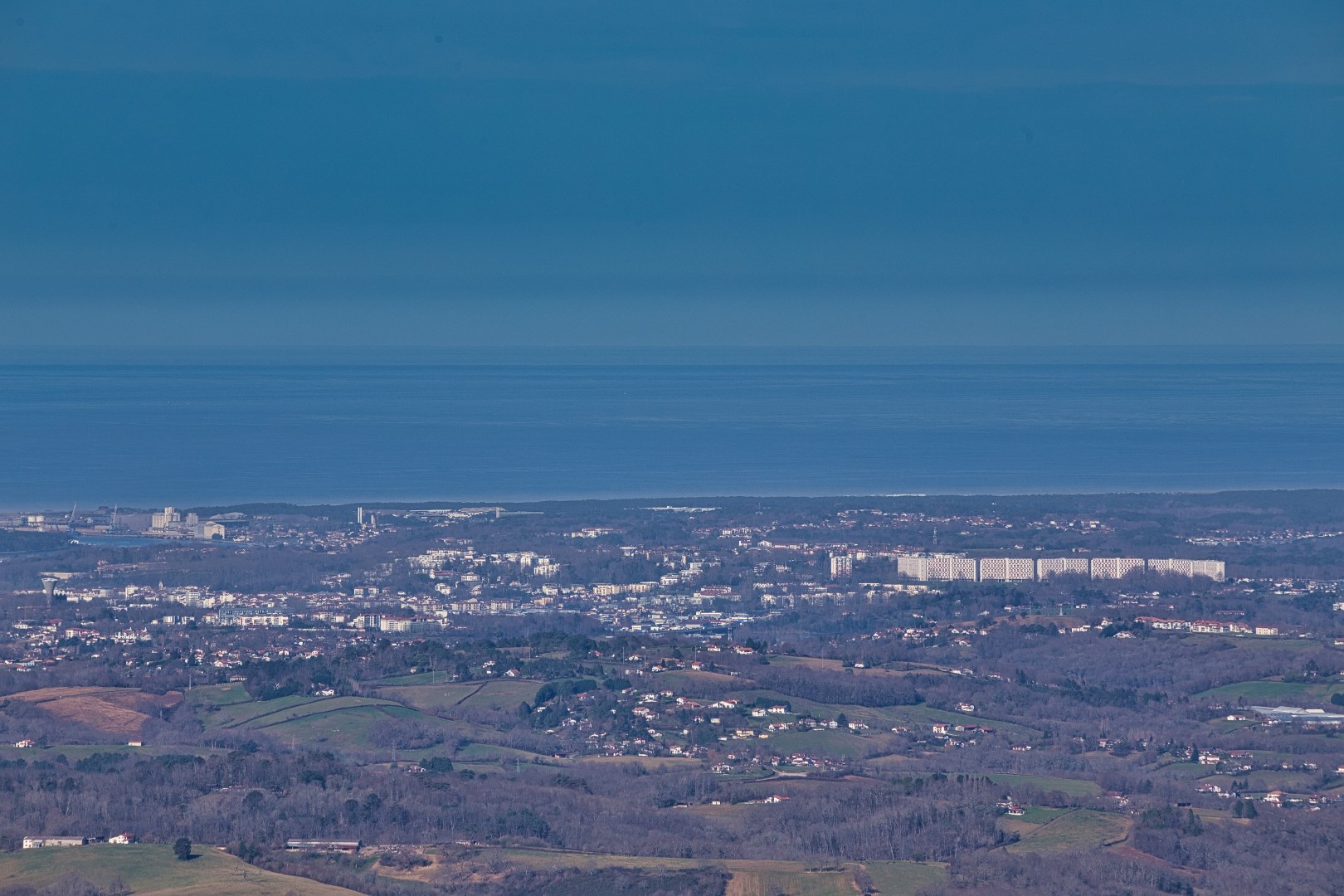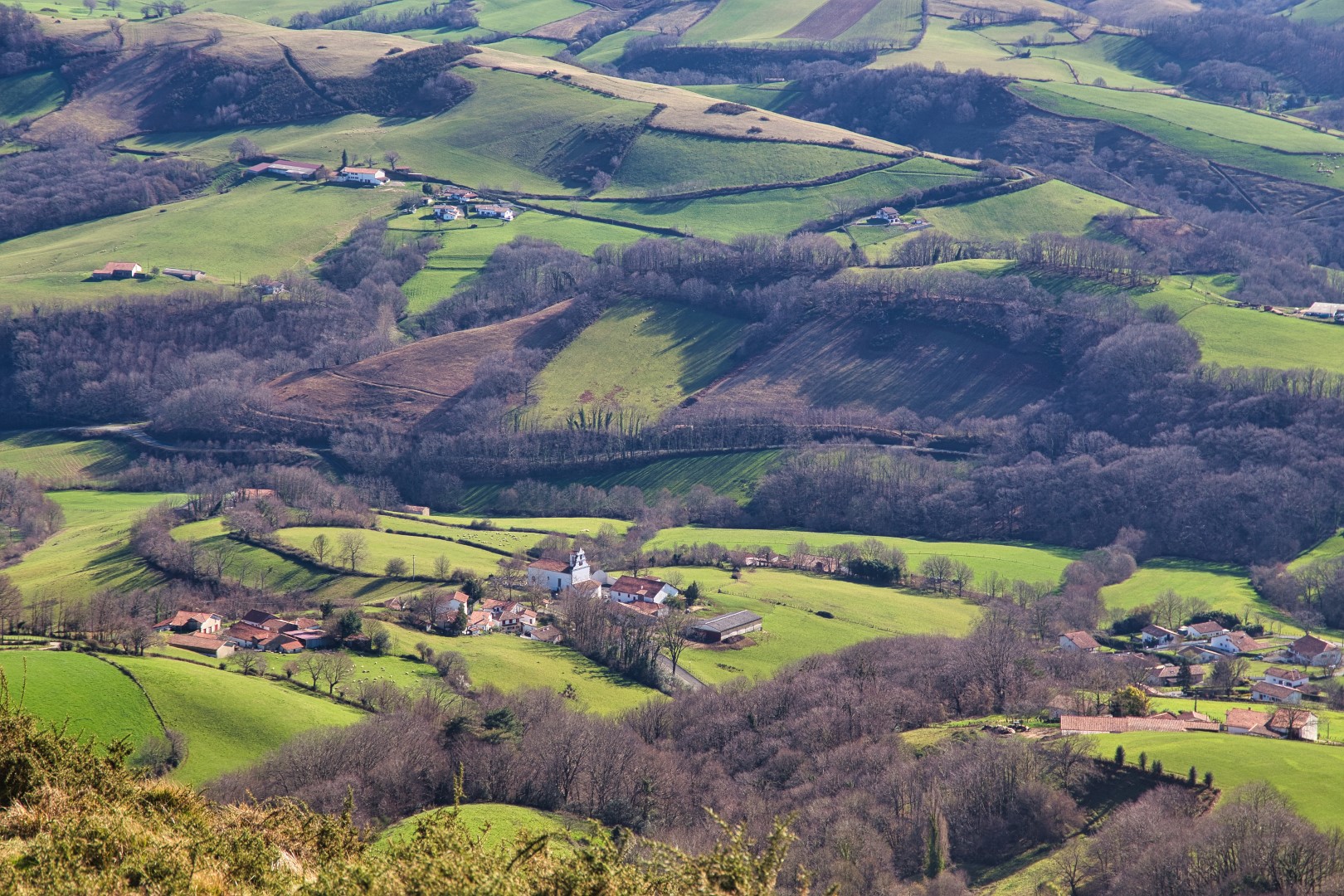 La suivre pendant 600 m en traversant un autre bois de châtaigniers. A 5,10 km, laissez le chemin au niveau du virage à droite et prendre à gauche le sentier qui fait un angle aigu. Rejoignez la grange,belle vue sur l’Artzamendi et le Mondarrain, et prenez à droite la piste blanche pendant environ 400m. Quittez la piste en prenant un chemin à gauche; 100m plus loin passez près d’une petite maison avec un pin. Suivez le sentier en restant toujours sur la gauche. A 6,4 longez un bosquet et au croisement suivant prenez à gauche puis atteindre le sommet.